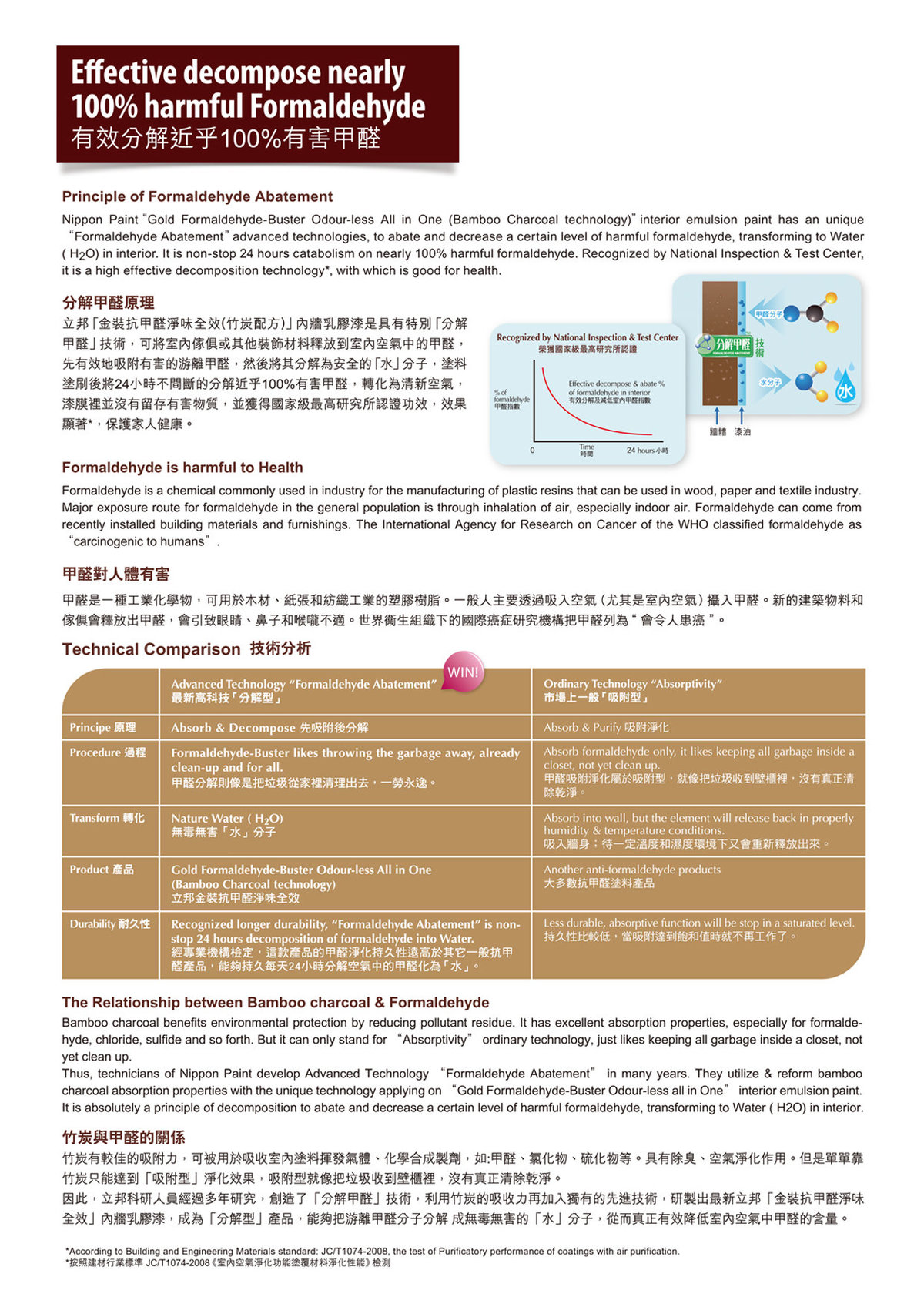 立邦金裝抗甲醛淨味全效(竹炭配方)內牆乳膠漆是「立邦淨味技術」和「分解甲醛」技術完美結合的全新高檔產品。它不僅能大幅度降低產品中殘存氣味,達到真正的淨味,而且能有效降低室內空氣中的甲醛含量。此外,它還集多種全效功能於一體,全面解決牆面問題,為您提供最佳的牆面效果。特別適合於室內裝修及舊牆翻新。它同時具有電腦調色功能,可於全港九各立邦配色中心內選擇自己喜愛的顏色,色彩自由mix & match。 (因個別電腦顯示器之不同設定而有差別及色差,建議閣下可參考產品色咭,如需要色咭請到立邦網站登記索取) |