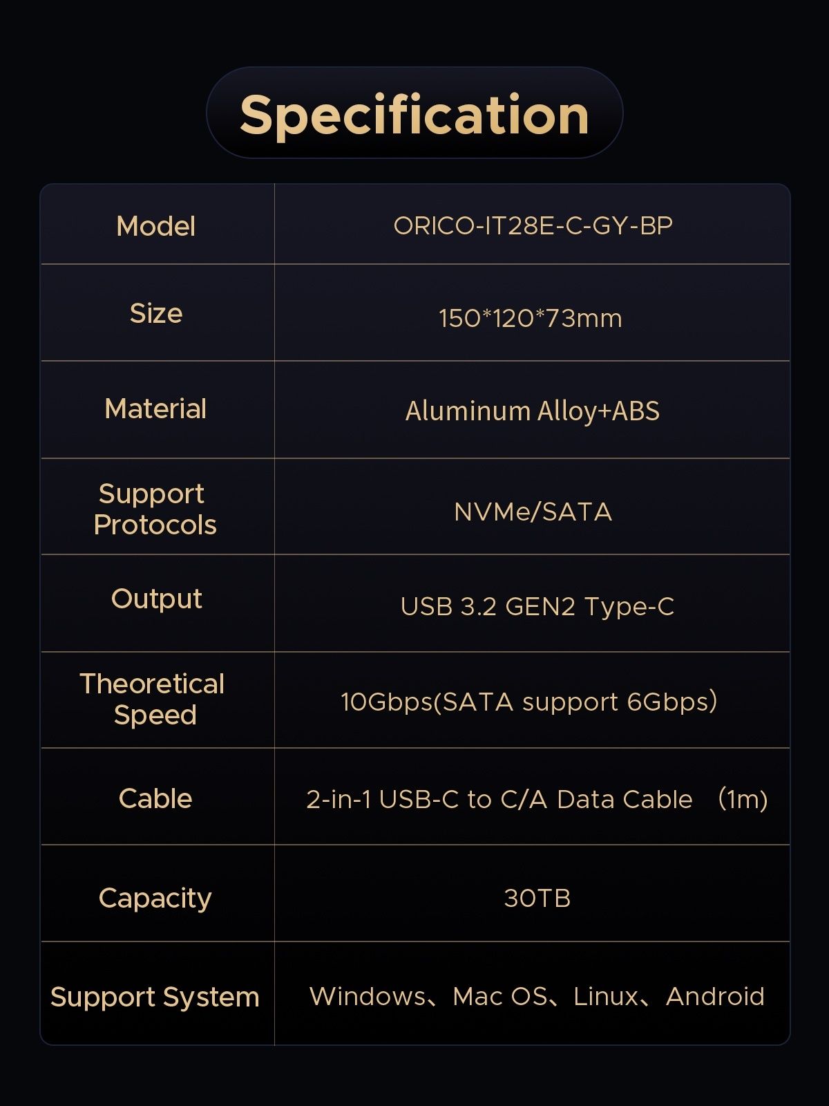 產品型號 ORICO-IT28E-C 顏色 灰色 材質 合金、ABS 尺寸150*120*73mm 相容性 M.2 NVMe SSD、2.5 吋 SSD/HDD、3.5 吋 HDD 傳輸速率 10Gbps 主機介面 Type-C USB-C 至 USB-C/A 電線 支援的系統 Windows、Linux、Mac OS