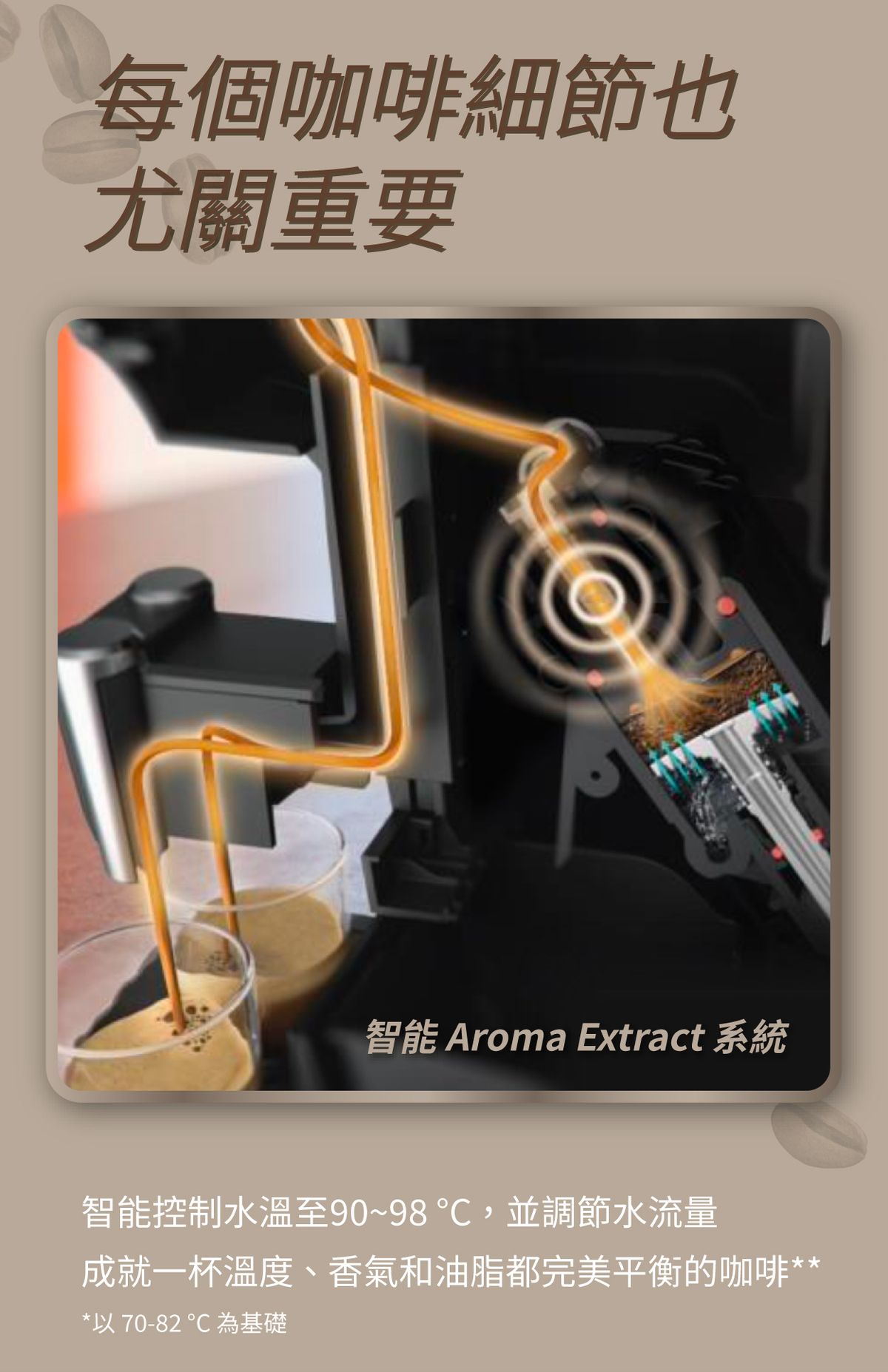 • 智能 Aroma Extract 系統將水溫保持在 90 至 98°C 之間,同時調節水流量,在沖調溫度和香氣提取之間達到最佳平衡,讓您享受美味的咖啡