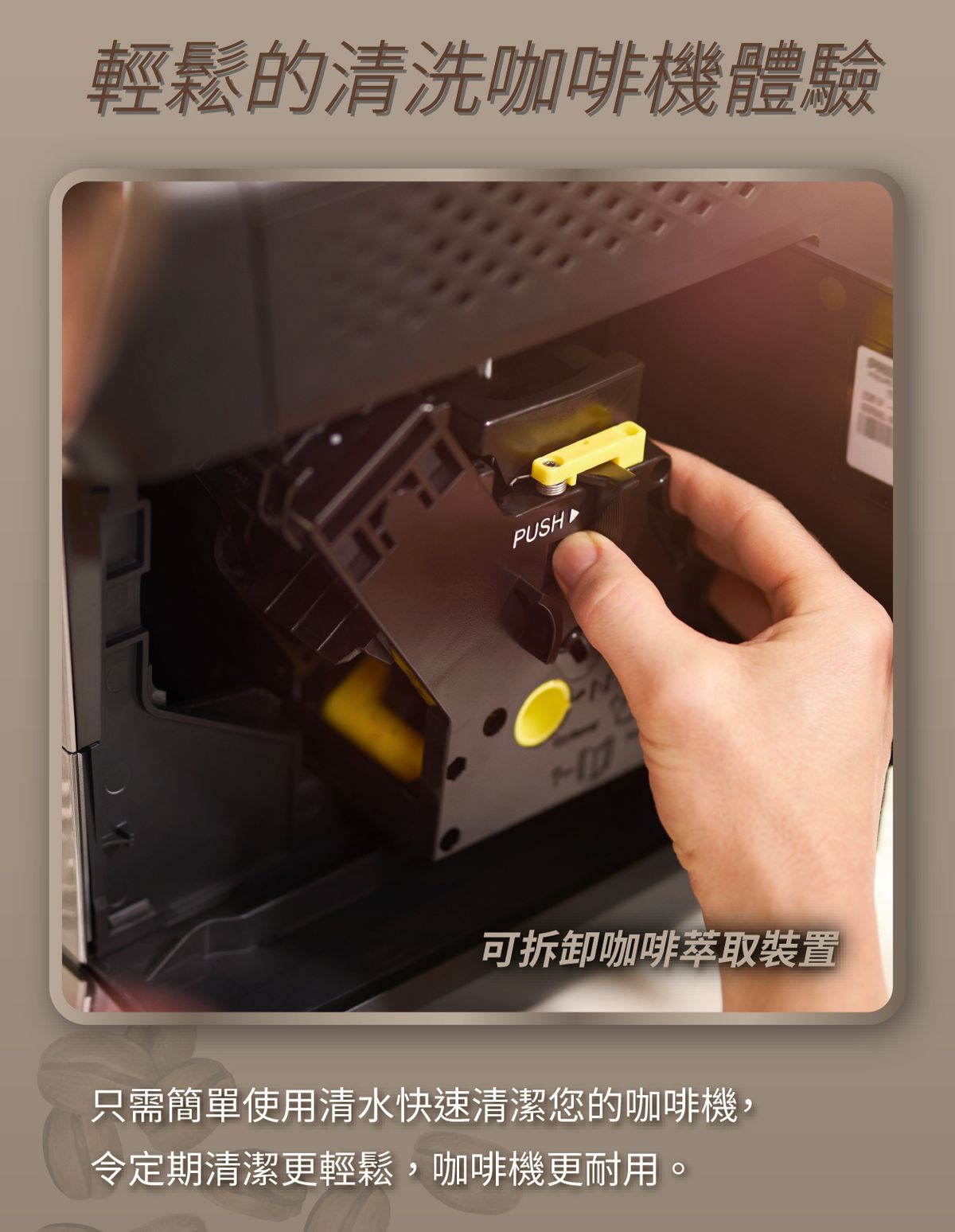 • 可拆式咖啡萃取裝置,簡單使用清水快速清潔您的咖啡機,令您的咖啡機更耐用