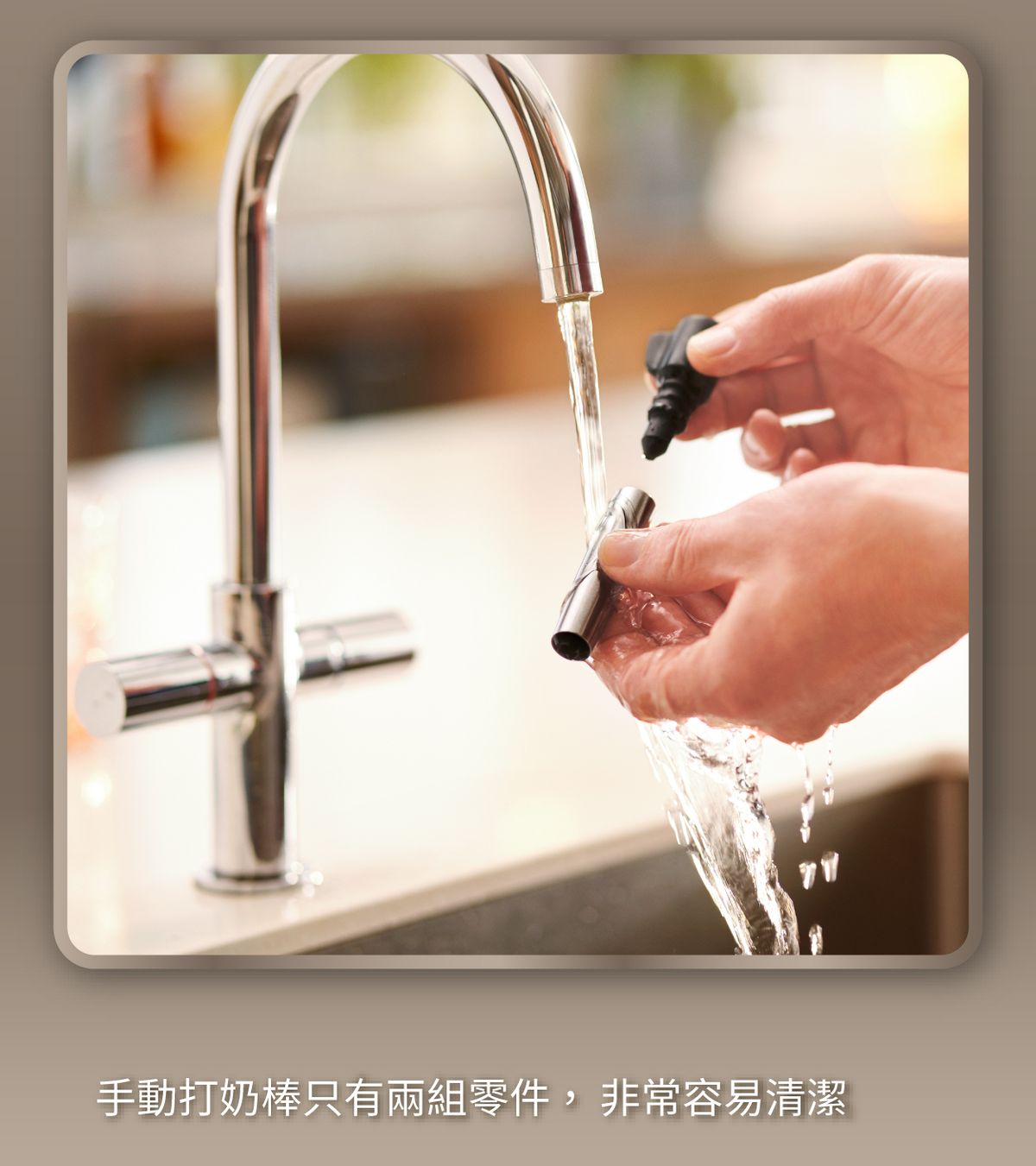 • 經典手動打奶棒可釋出蒸氣,讓您輕鬆為泡沫咖啡打出如絲般幼滑的奶泡。手動打奶棒只有兩組零件,非常容易清潔