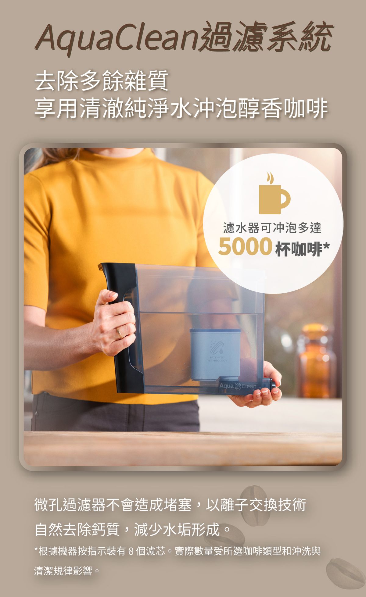 • 兼容專利 AquaClean 濾水器:按照咖啡機的提示更換濾水器,您可以在無需為咖啡機除垢的情況下最多沖泡 5000 杯咖啡**,同時享受清澈的純淨水