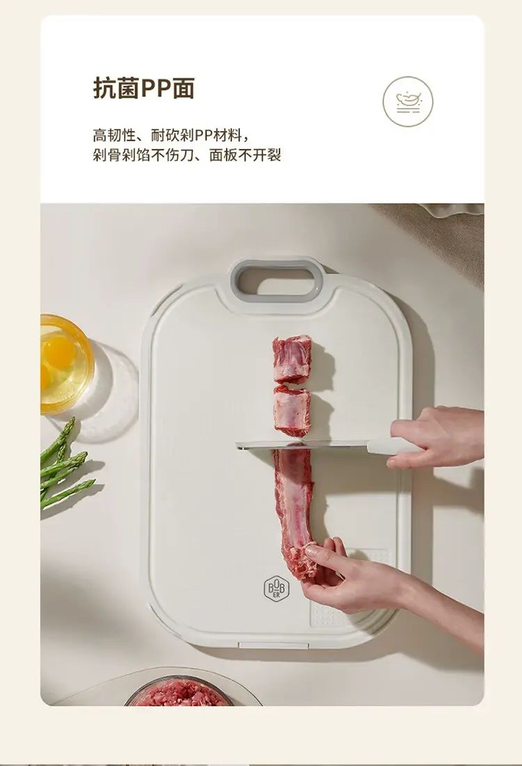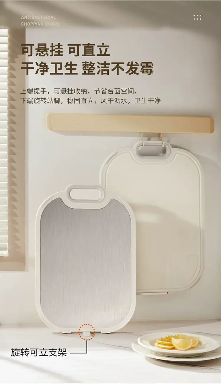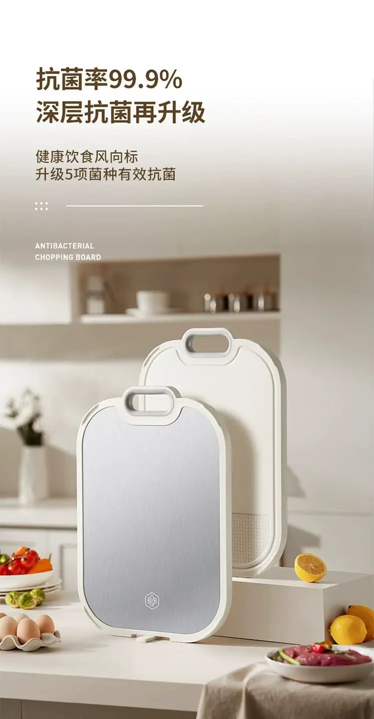 博堡-BOBER-双面抗菌不锈钢菜板 砧板 案板 产品规格:410*275*20mm 产品材质:中科院专利抗菌304不锈钢+抗菌PP+TPE(橡胶) 双面抗菌技术 抗菌率高达99.9% 整板抗菌再升级 抗菌不锈钢面板拉丝工艺处理 揉面不易粘 双面双用 生熟分切 精致切配 防串味 防滑硅胶包边 遇水不易滑 稳稳切配 可悬挂 可站立 随心收纳 使厨房整洁有序 环形导水槽 汁水不外溢 台面干净整洁