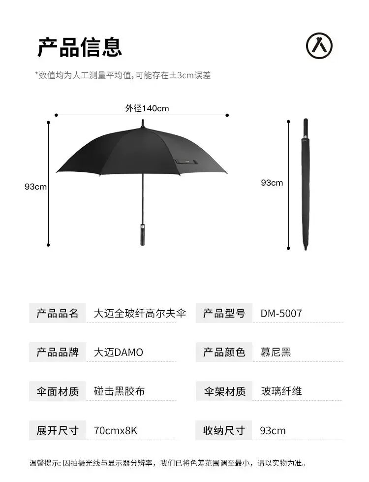 产品品牌:大迈-DAMO 产品品名:大迈全玻纤高尔夫伞 产品型号:DM-5007 伞架材质:玻璃纤维 产品颜色:幕尼黑 伞面材质:碰击黑胶布 展开尺寸:70cm*8k 收纳尺寸:93cm