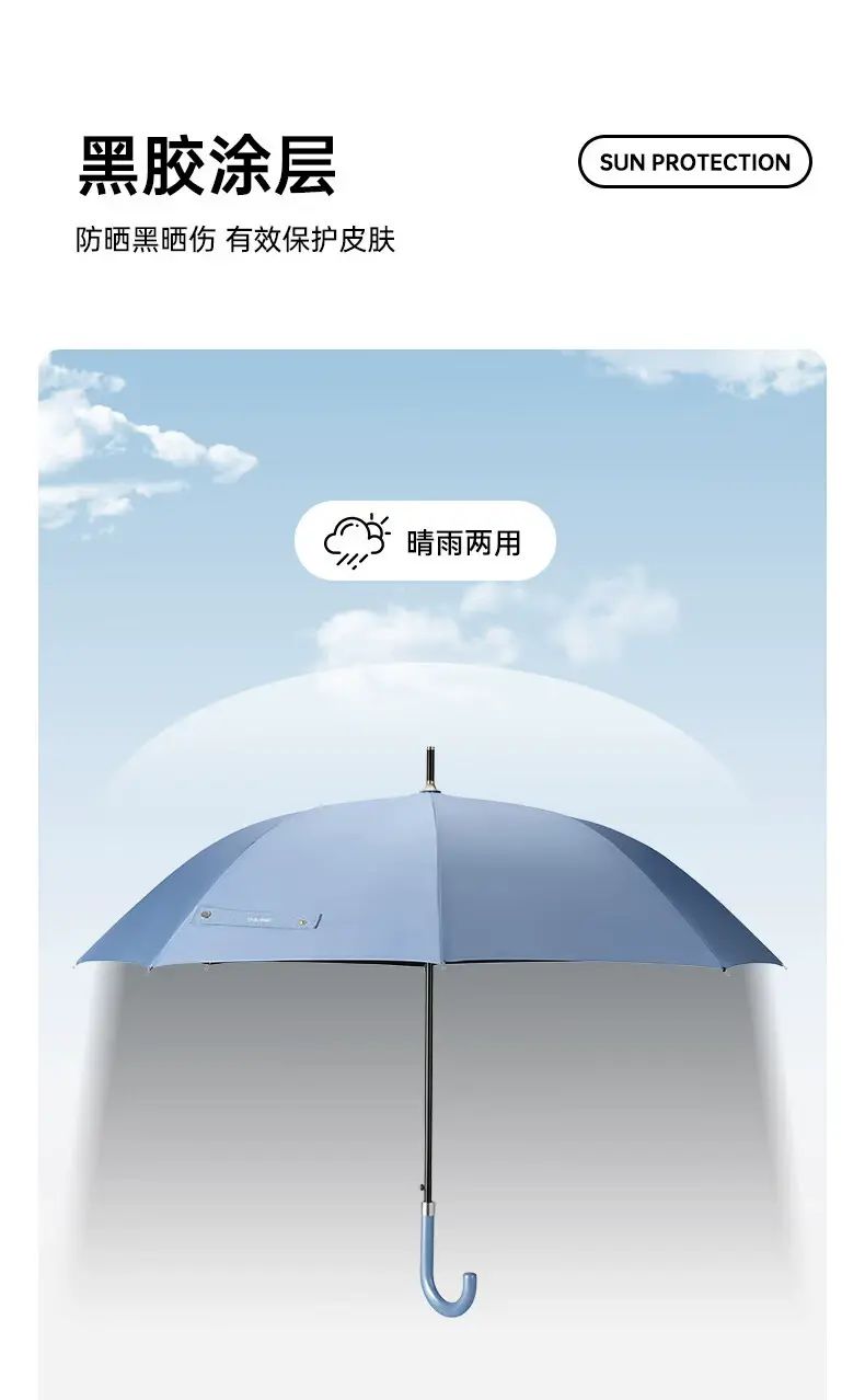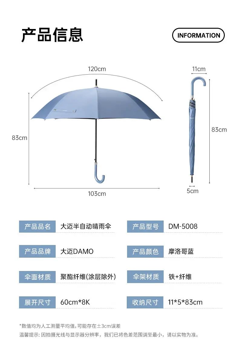 产品品牌:大迈DAMO 产品名称:半自动晴雨伞 产品尺寸:展开60cm*8K 收纳11*5*83cm 产品材质:聚酯纤维(内涂黑胶)+铁+纤维 产品颜色:摩洛哥蓝 弯钩手柄,珠光蓝配色。 中棒按钮,一键开伞。 尾骨纤维,增强抗风。 黑胶防晒,晴雨两用。