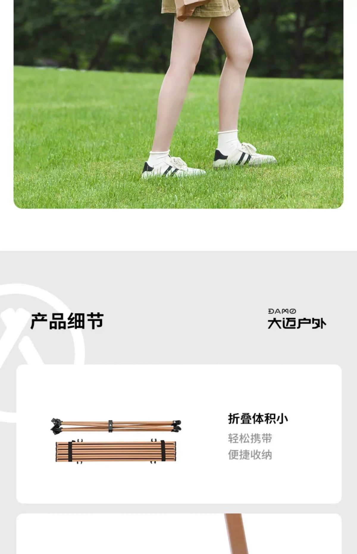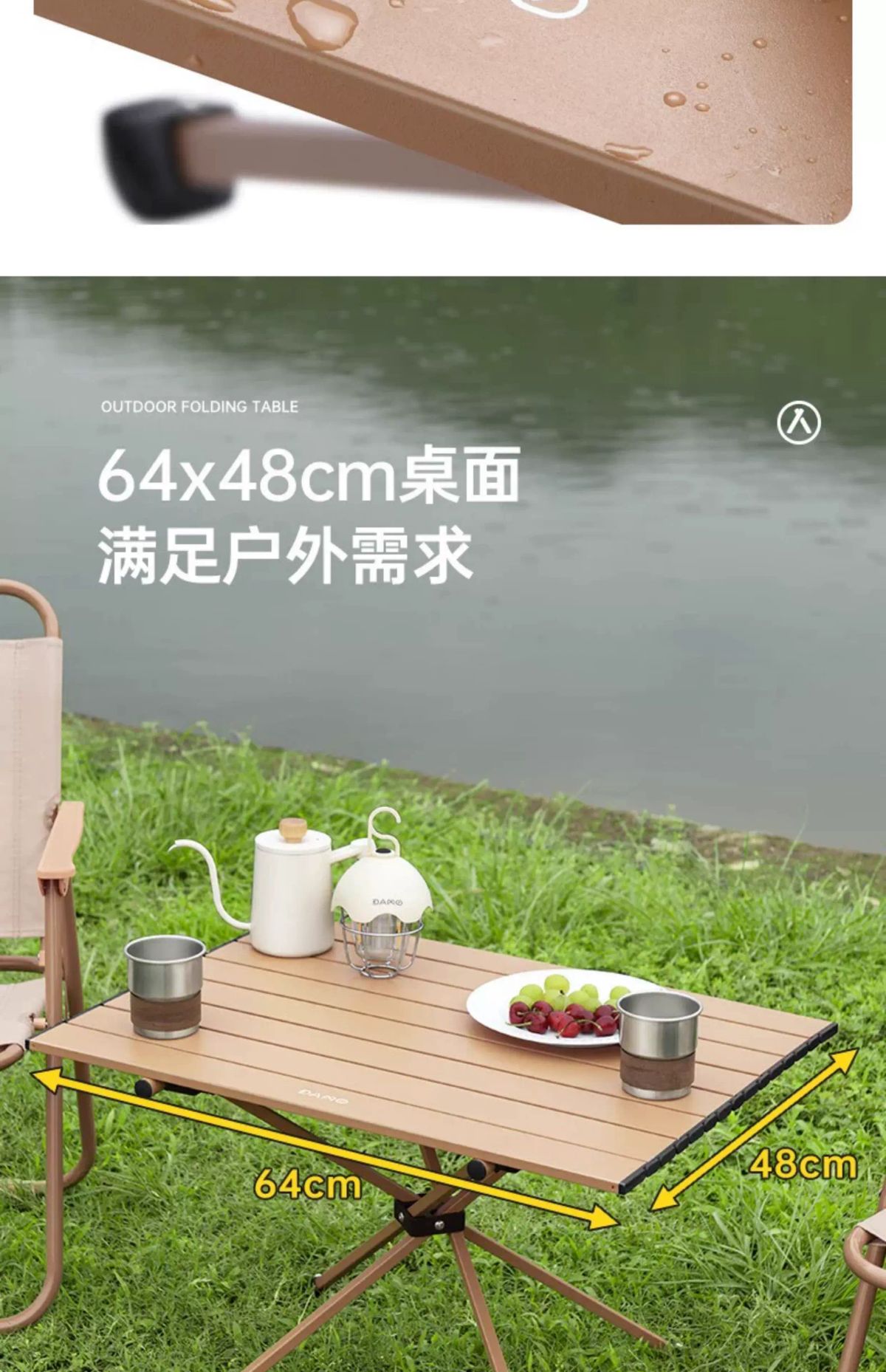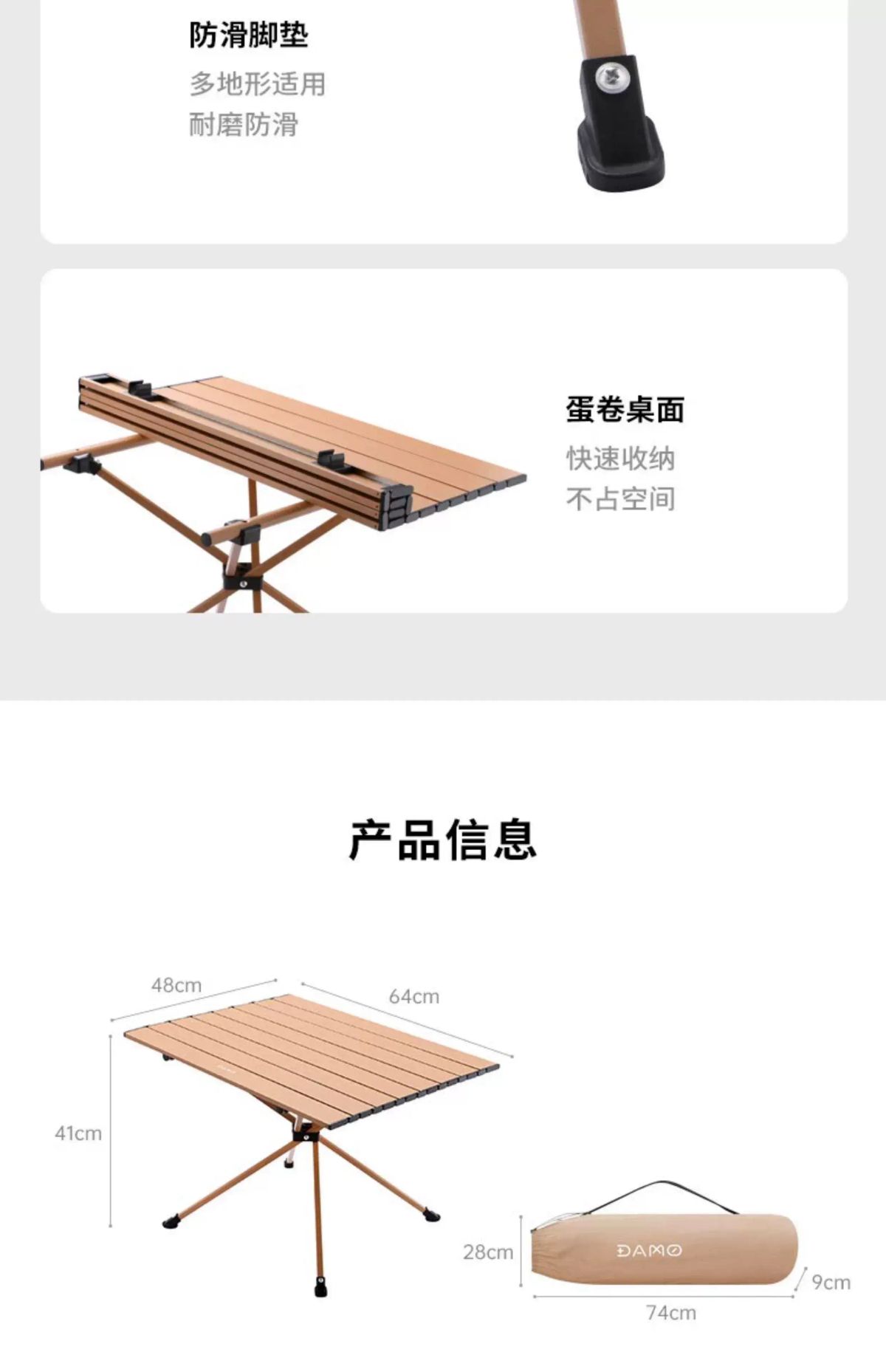 坚固钢管 平稳牢固 聚拢桌腿 加强稳固 承重60斤 防滑脚垫 耐磨防滑 快速折叠 易收纳 单手可提 便携出行 产品品牌:大迈 DAMO 产品品名:聚拢折叠桌 产品型号:DM-2015 产品颜色:热带棕 产品材质:碳钢合金 展开尺寸:64*48*41cm 收纳尺寸:74*28*9cm