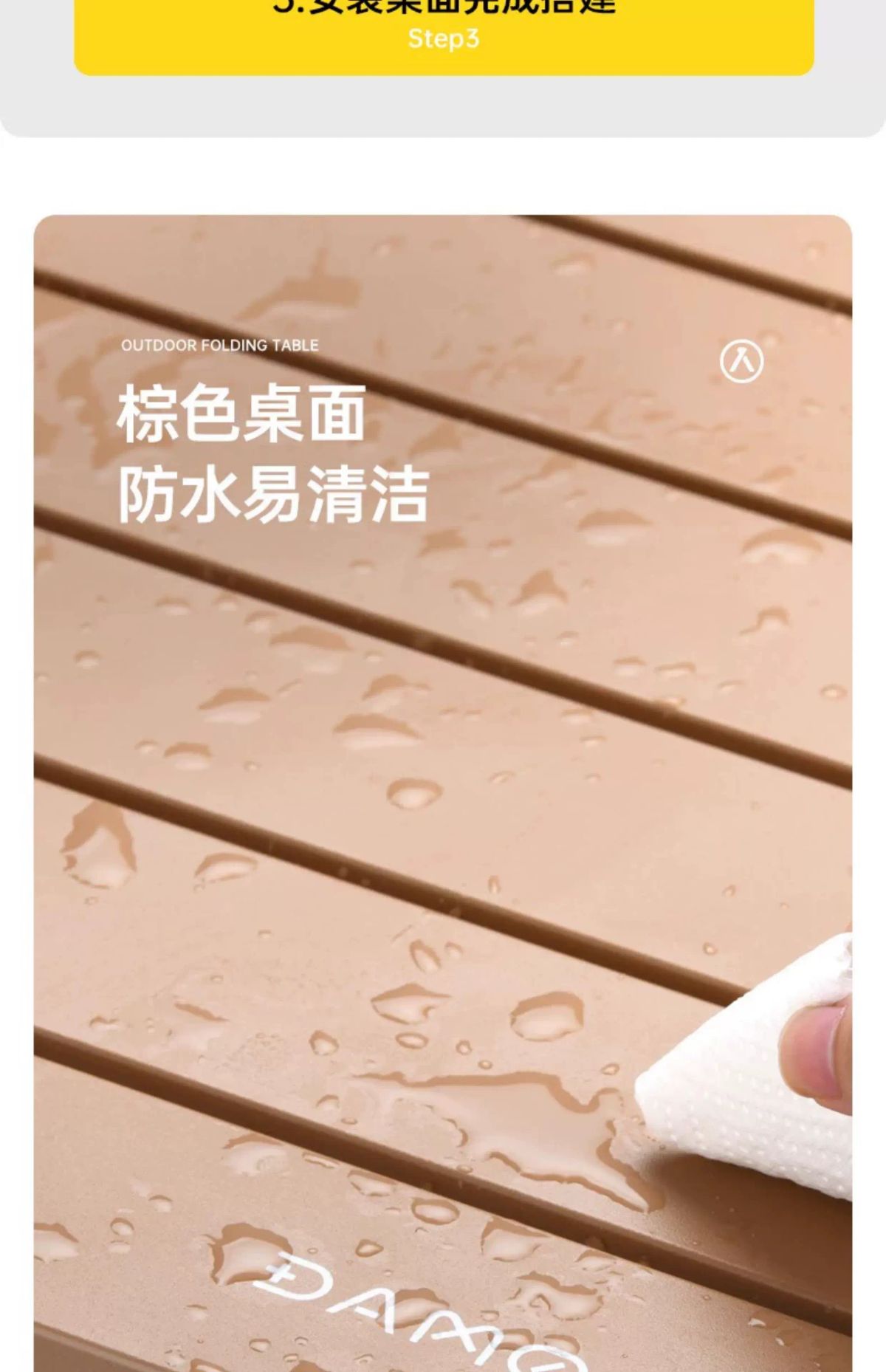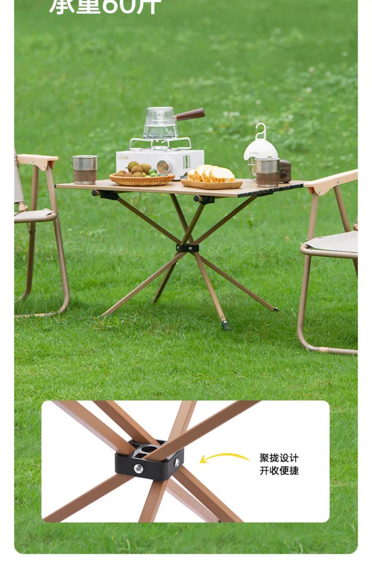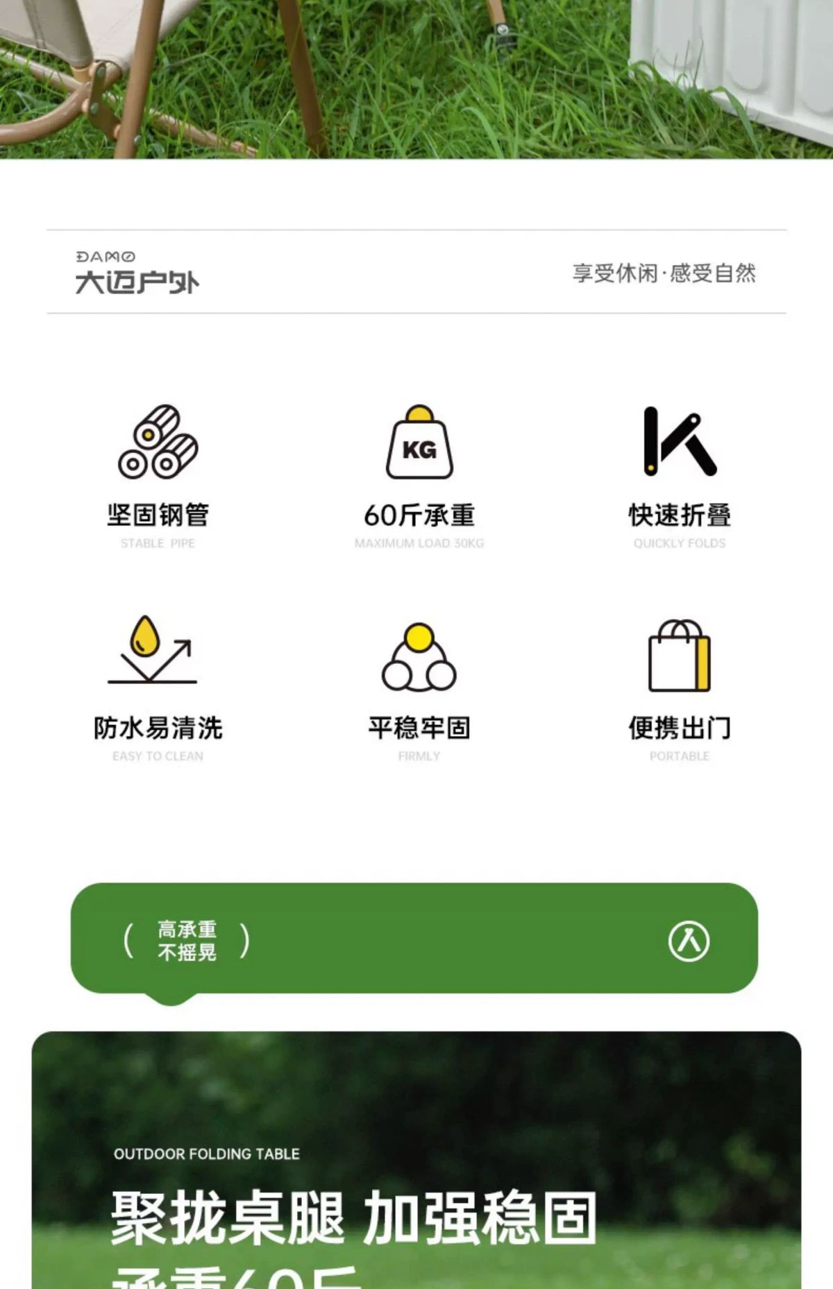坚固钢管 平稳牢固 聚拢桌腿 加强稳固 承重60斤 防滑脚垫 耐磨防滑 快速折叠 易收纳 单手可提 便携出行 产品品牌:大迈 DAMO 产品品名:聚拢折叠桌 产品型号:DM-2015 产品颜色:热带棕 产品材质:碳钢合金 展开尺寸:64*48*41cm 收纳尺寸:74*28*9cm
