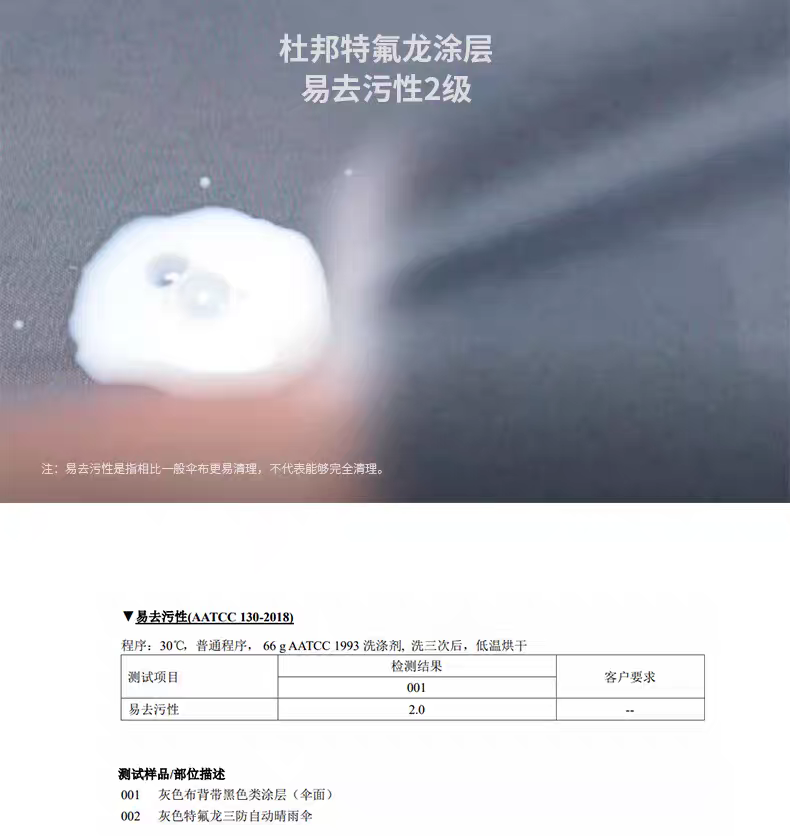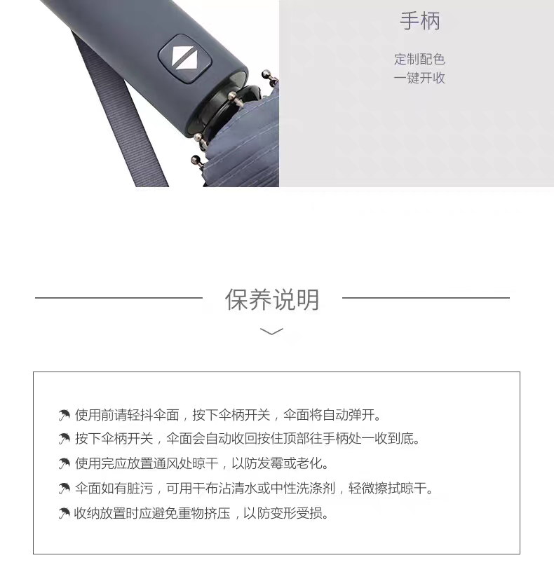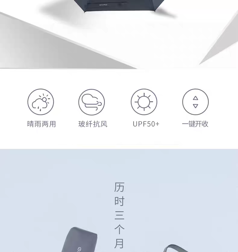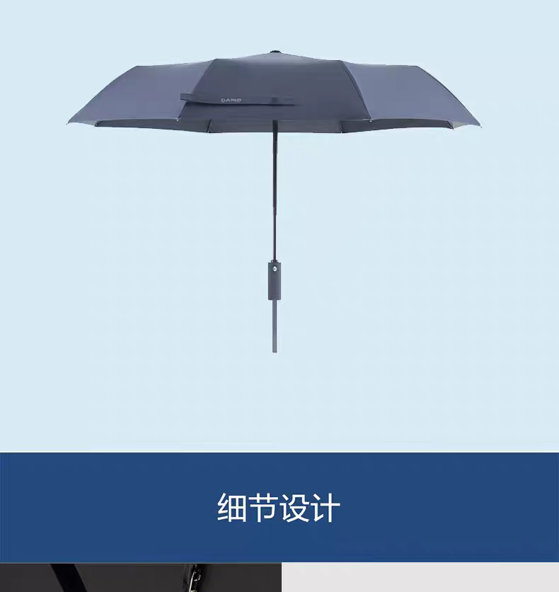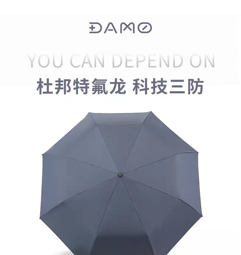产品品牌:大迈 DAMO 产品品名:特氟龙三防自动晴雨伞 产品型号:DM-5005 产品颜色:雅致灰 伞面材质:特氟龙碰击黑胶布 产品规格:53.5CM*8K 伞架材质:铁+玻纤 产品功能:防雨+防晒