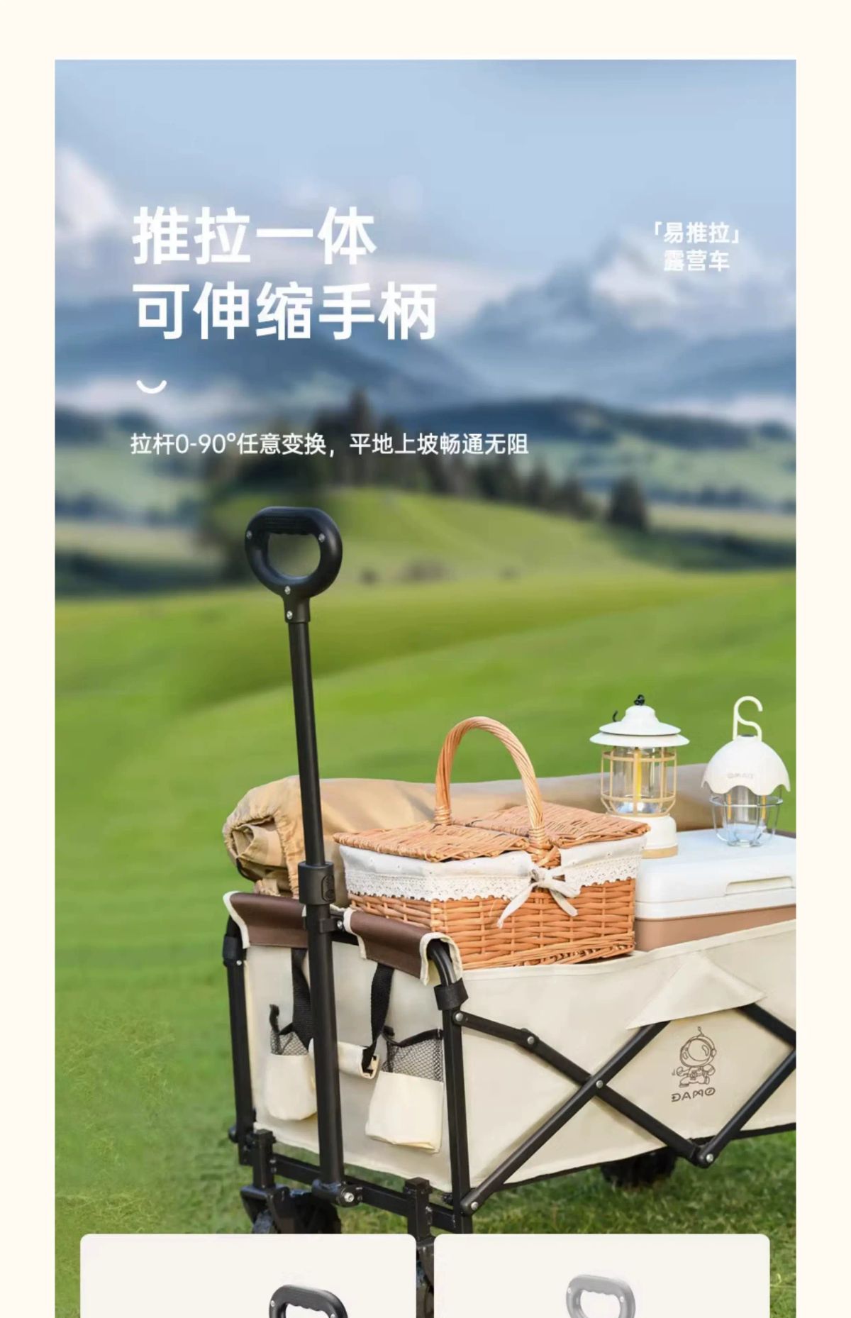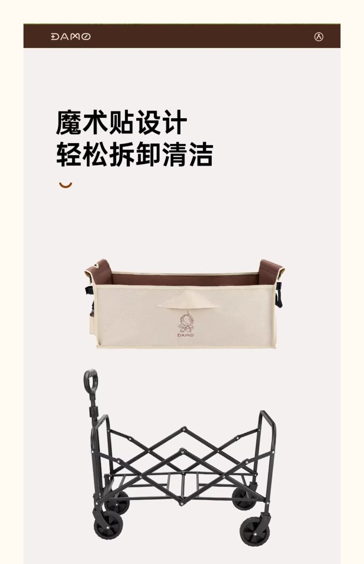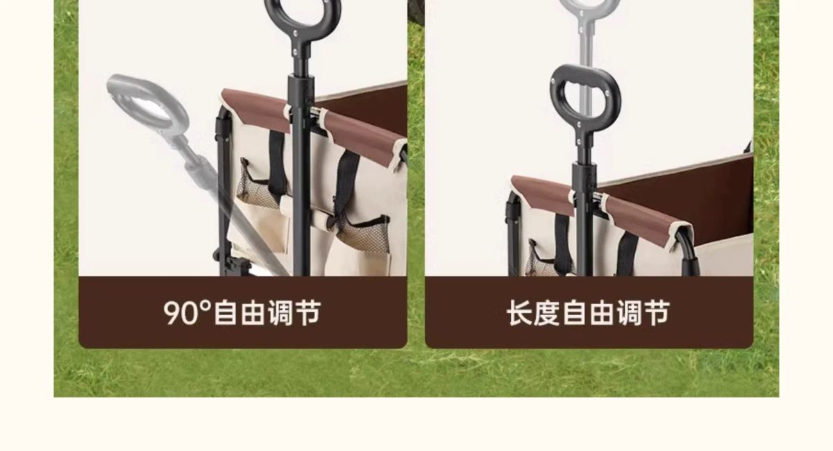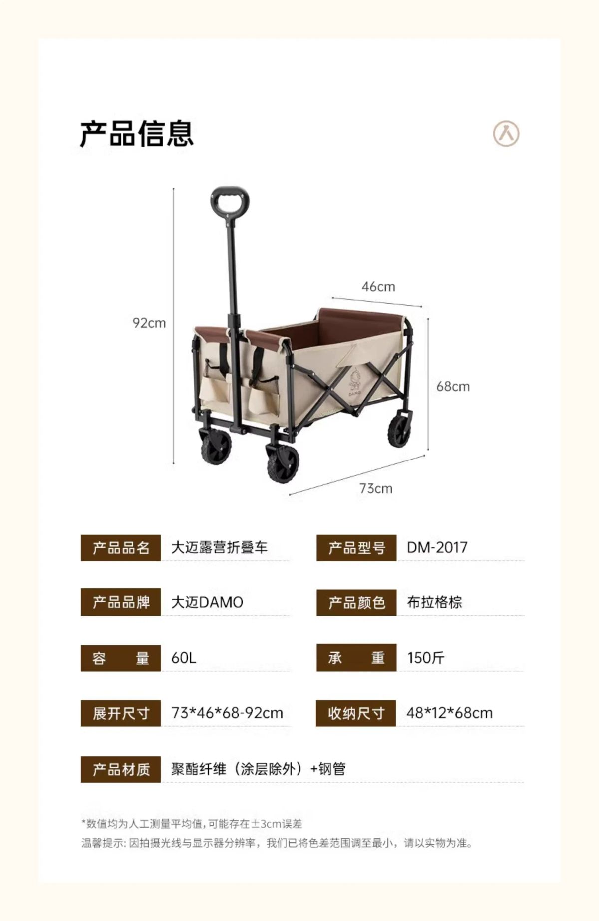 产品名称:露营折叠车 产品型号: DM-2017 产品颜色:布拉格棕 产品尺寸:展开73x46x68-92cm 收纳48x12x68cm 产品材质:双层牛津布+钢管+PVC轮 拉杆内置弹簧,把手不落地。 双层布兜容量66L,内外配色。 多节喷塑铁管,承重可达50kg。 三秒折叠,可放后备箱不占空间。