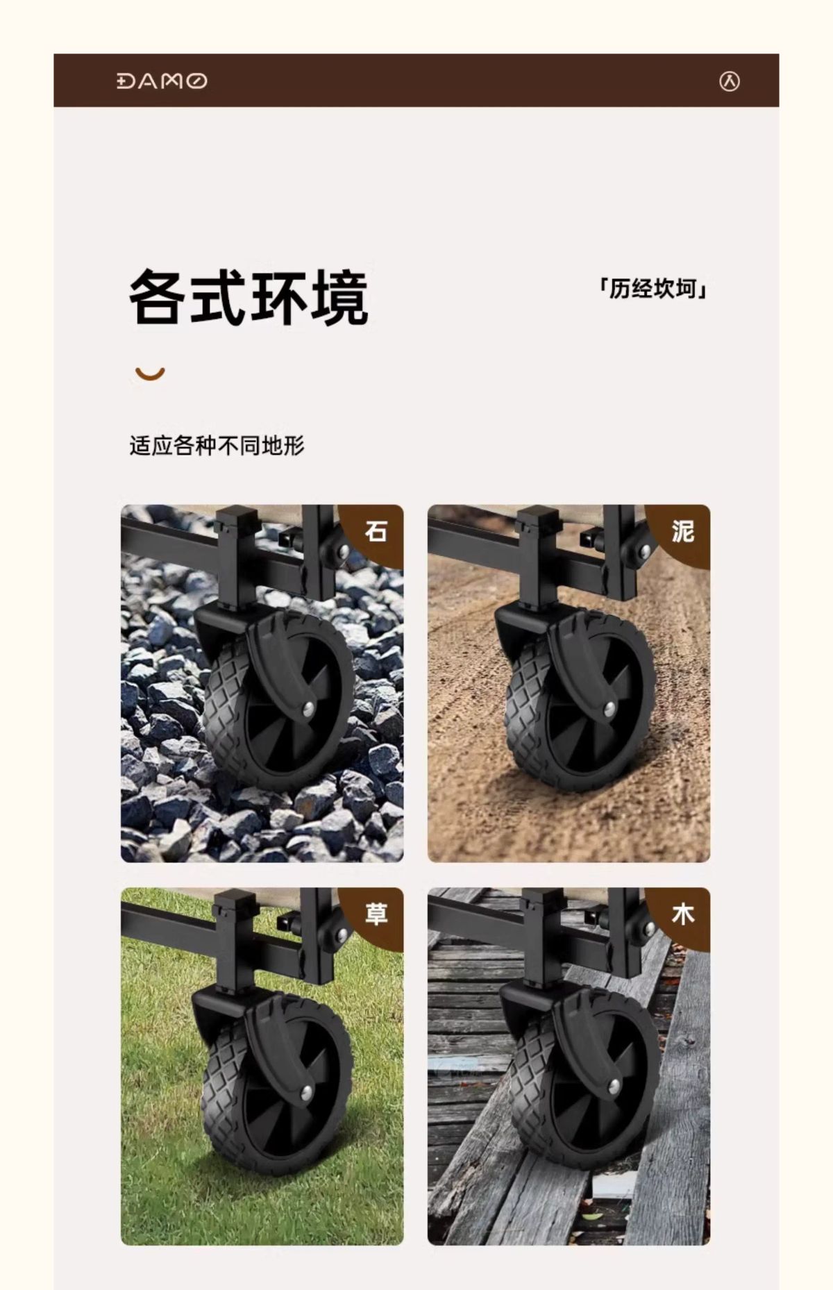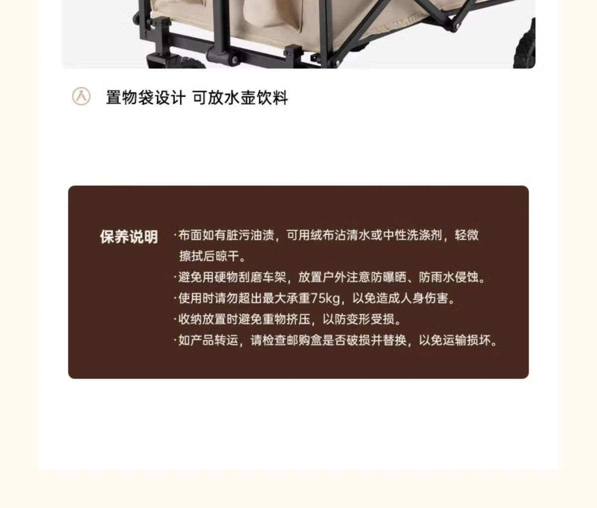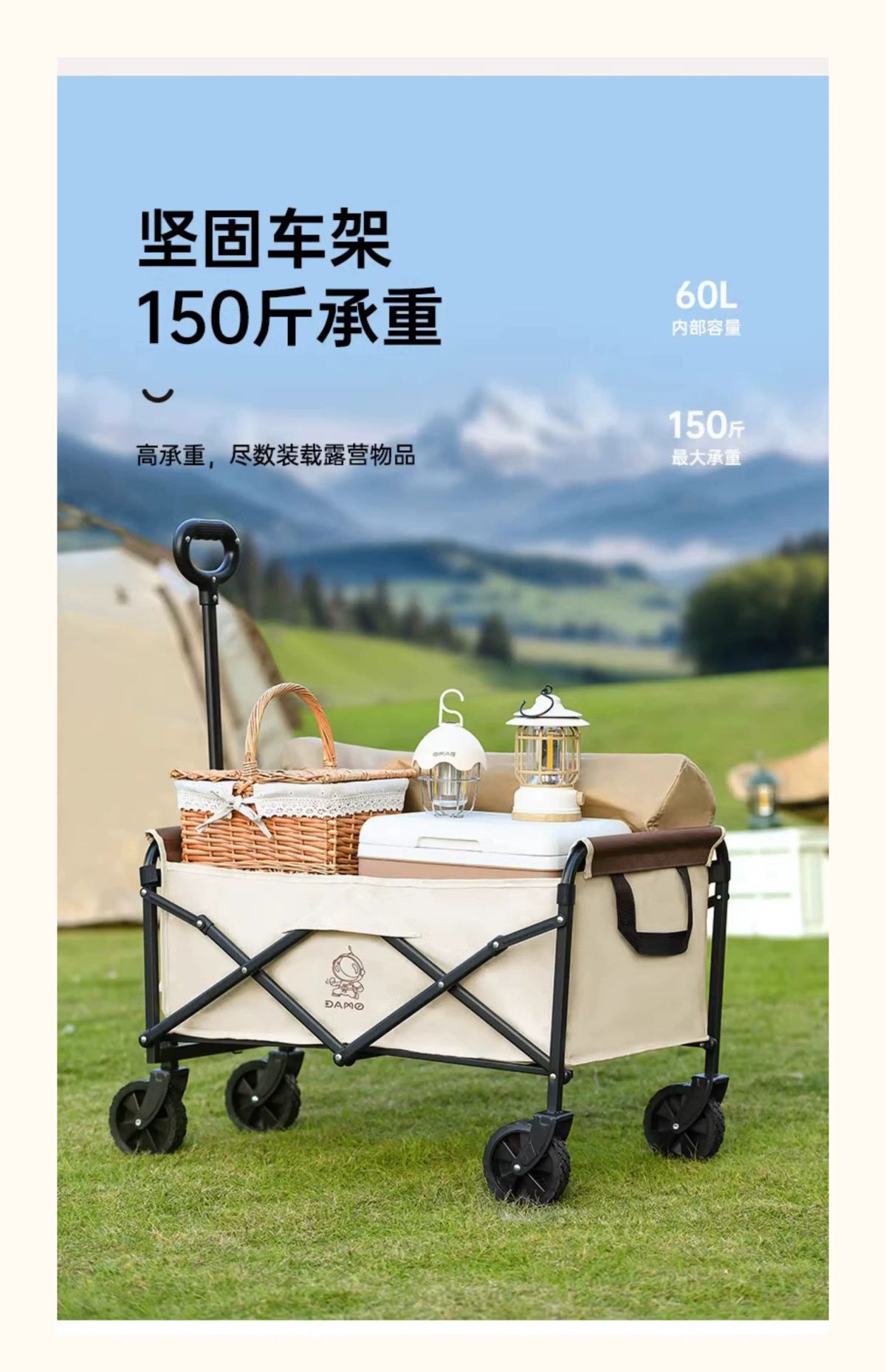 产品名称:露营折叠车 产品型号: DM-2017 产品颜色:布拉格棕 产品尺寸:展开73x46x68-92cm 收纳48x12x68cm 产品材质:双层牛津布+钢管+PVC轮 拉杆内置弹簧,把手不落地。 双层布兜容量66L,内外配色。 多节喷塑铁管,承重可达50kg。 三秒折叠,可放后备箱不占空间。