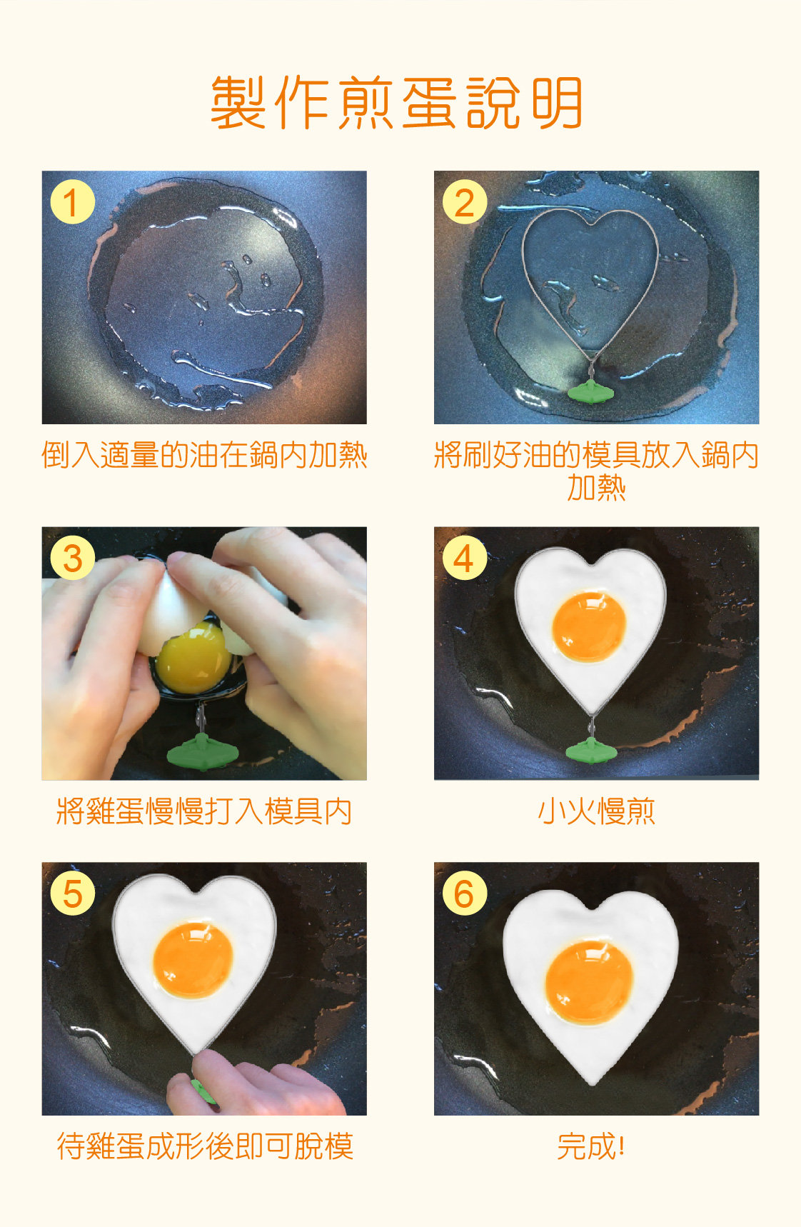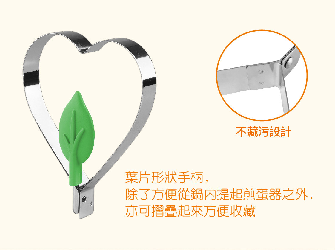 商品簡介 不銹鋼製成, 可造成心形的煎蛋, 薄煎餅等; 手柄可摺疊起來, 方便收藏。