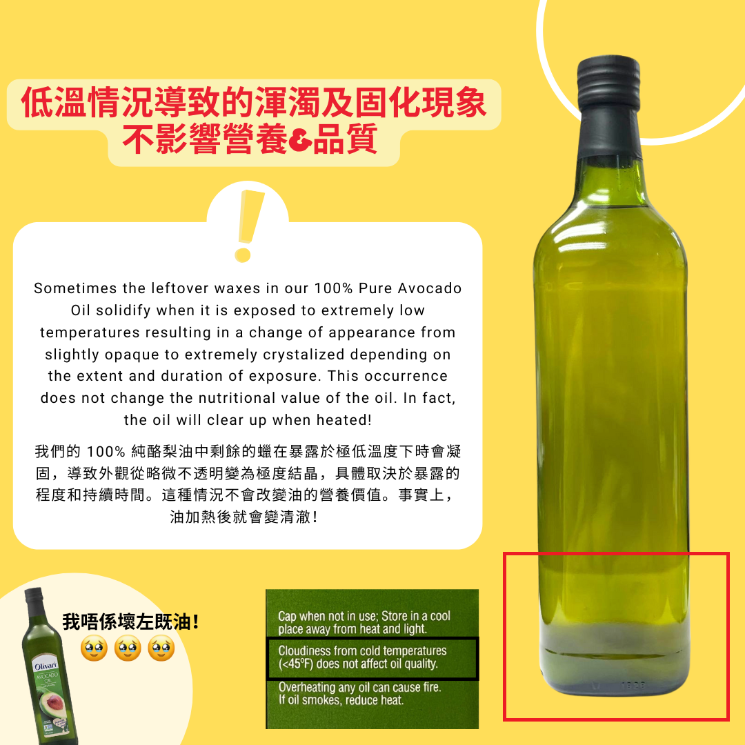 1L裝美國 Olivari 冷榨 玻璃樽 牛油果油 1L 平行進口 *渾濁*美國冬天批次會出現渾濁和凝固, 乃正常物理現象, 不影響品質 有時,我們的 100% 純酪梨油中剩餘的蠟在暴露於極低溫度下時會凝固,導致外觀從略微不透明變為極度結晶,具體取決於暴露的程度和持續時間。這種情況不會改變油的營養價值。事實上,油加熱後就會變清澈! |
