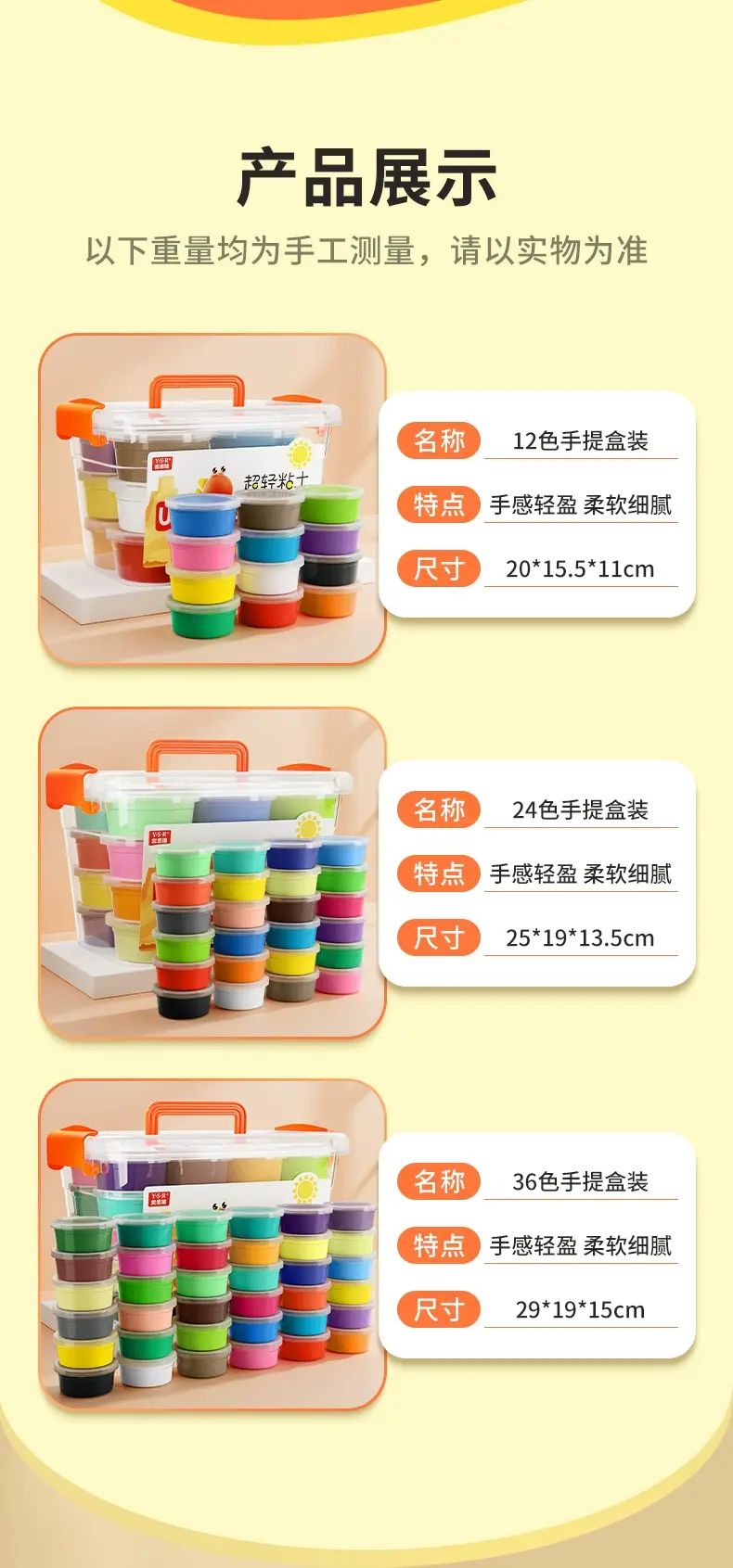 | 商品簡介 | 超轻粘土儿童彩泥橡皮泥幼儿园专用无毒无味24色食品级黏土36玩具;;颜色分类:【24色袋装】送配件工具 |