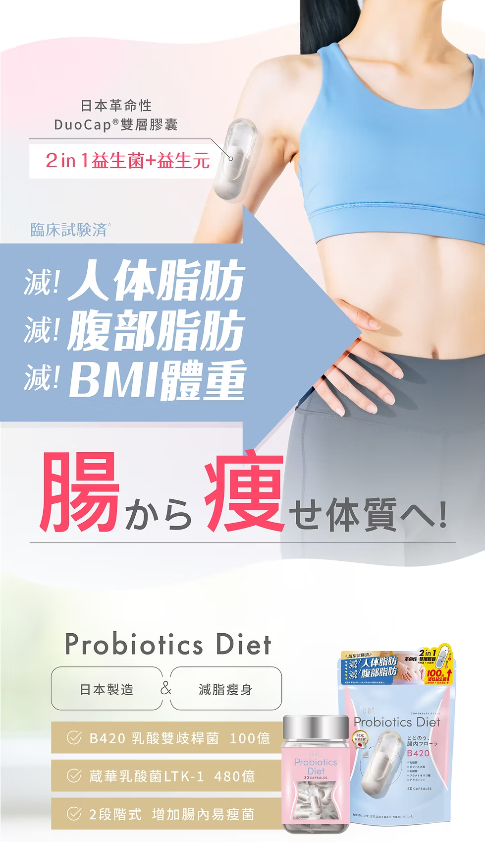 日本人氣 feat. 減脂瘦身益生菌,嚴選100億 B420乳酸雙歧桿菌,臨床證實有效大幅消減人體脂肪及腹部脂肪。配合蔵華乳酸菌LTK-1,抑制脂肪吸收。利用日本革命性雙層膠囊技術,結合益生元及益生菌,提高活性益生菌的吸收率及穩定性,更長效持久。