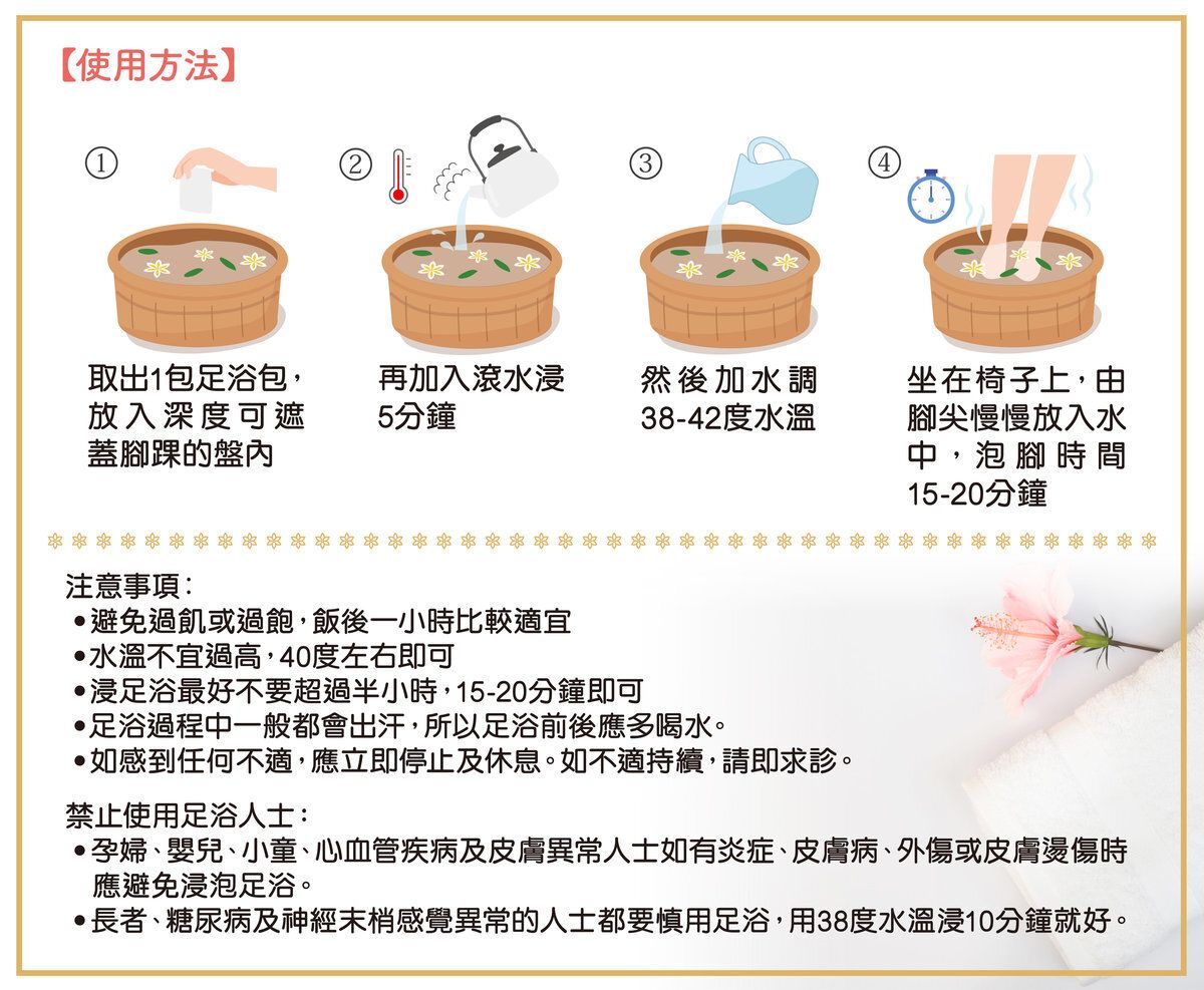 足浴能去除濕氣防百病。中醫師表示,足浴的好處非常多,加入中藥材、草本等材料,比起只用熱水泡腳,更可達到去浮腫、祛濕、暖身、幫助睡眠、提高免疫力,以及預防感冒等好處。