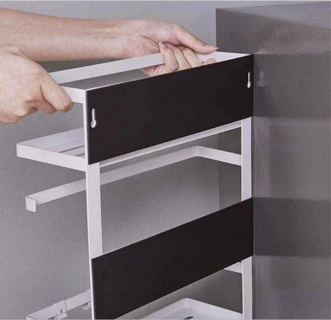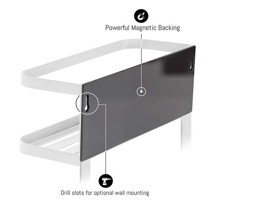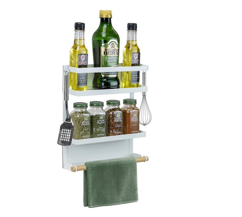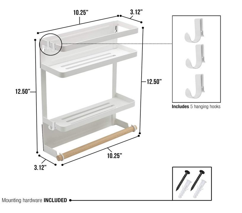 一目了然找到您所有的廚房用品!磁性儲物架增添風味和功能。這款收納架非常適合任何冰箱,既省時又省力,可在凌亂的廚房中尋找所需的食材和用品。它具有(2)儲物架,(1)木製紙巾桿和(3)掛鉤,用於掛置毛巾等物品。只需將磁性放回冰箱或磁性表面即可整理所有香料,調味料和家居用品。最重要的是,享受新發現的櫃檯和櫥櫃空間。